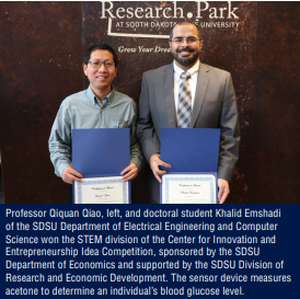 2020Dr. Emshadi and his colleagues developed a sensor to monitor blood sugar through breath. Dr. Emshadi won the STEM division of the Center for Innovation and Entrepreneurship Idea Competition for his inventing a sensor device that measures acetone to determine an individual’s blood glucose level. This competition was sponsored by the SDSU Department of Economic and Division of Research and Economic Development.